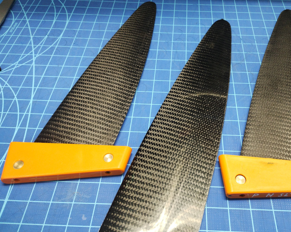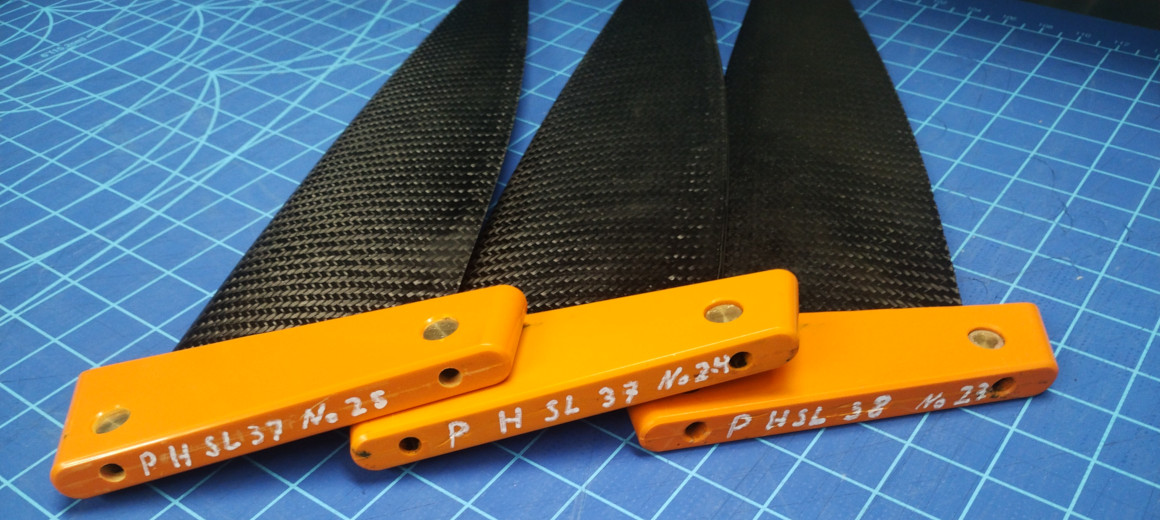 Our racing fins are manufactured by high-performance high modulus and intermediate modulus carbon fibers. Woven, multiaxial and unidirectionals – we use them all. The molding process is a development of Resin Transfer Molding (RTM), where vacuum and pressure is transferring epoxy-resin into the closed mold, giving the very lowest void content and corresponding highest strength. When the fin comes out of the mold, it is smooth and shiny. The essential afterwork, is to sand it down with fine grit in a defined process to make it robust against spinouts. It is almost a shame to tamper with the shiny surface ..